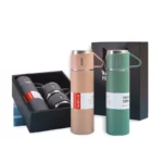 - Matériaux durables : La bouteille et les tasses sont fabriquées avec une double paroi en acier inoxydable pour une isolation efficace et une grande durabilité.