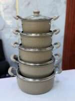 - Composition : 5 marmites avec couvercles (total 10 pièces).