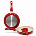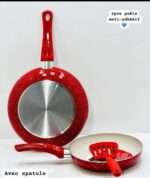 Ce lot comprend deux poêles anti-adhésives au design moderne rouge moucheté, idéales pour une cuisson quotidienne pratique et rapide. L’intérieur clair avec revêtement anti-adhésif permet de cuisiner avec peu de matière grasse et facilite grandement le nettoyage. Le fond métallique assure une bonne répartition de la chaleur, tandis que les manches ergonomiques offrent une prise en main confortable. Une spatule assortie est incluse pour une utilisation immédiate sans abîmer le revêtement.