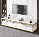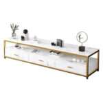 Ce meuble TV de 140 cm combine un design moderne avec une structure élégante. Son plateau effet marbre associé à un cadre doré apporte une touche décorative raffinée à votre intérieur.