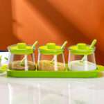 Set de 3 Pots à Épices en Verre Transparent avec Couvercles et Cuillères Intégrées (Vert Vif) – Ensemble Sucrier/Salier avec Plateau de Service – Rangement de Cuisine Design